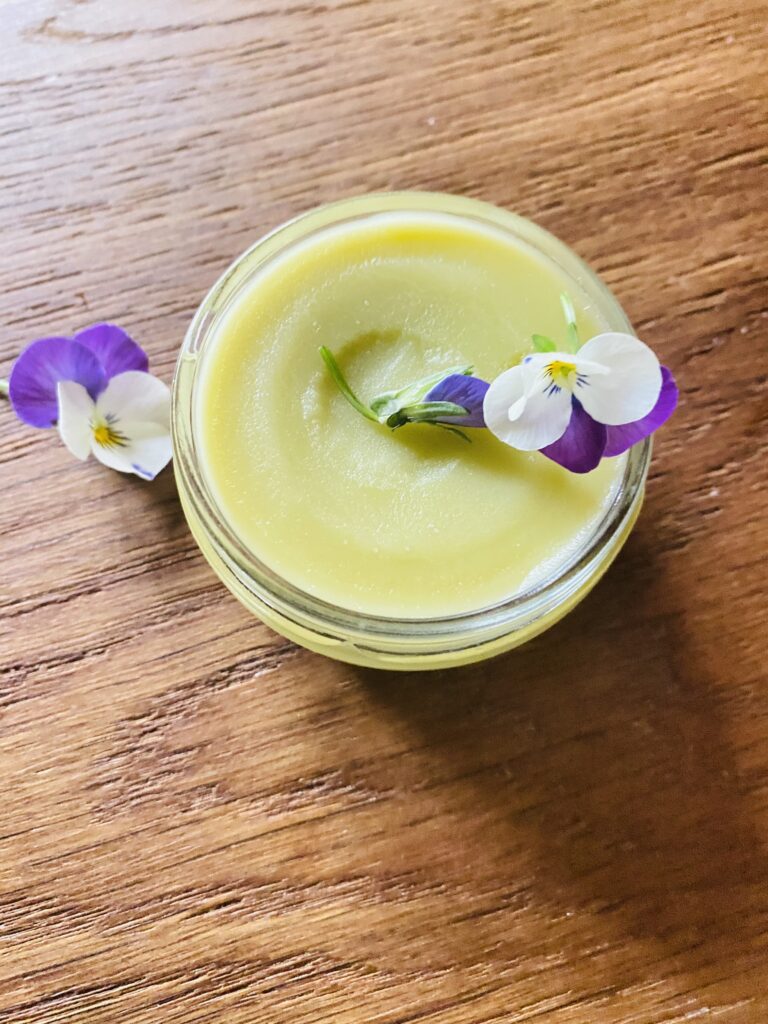 Das sehr fein zerkleinerte Veilchenkraut im Wasserbad mit dem Olivenöl und der Sheabutter bis zu ca. 40-50 Grad erwärmen. Danach mindestens bis zu einer Stunde ziehen lassen. Den Brei dann abseihen, am besten mit einer Windel, und gut ausdrücken. Zur handwarmen Salbe nun das Rosenöl einarbeiten, gut vermischen und in ein desinfizierten Glas (Salbentiegel) abfüllen, gut verschließen, beschriften und kühl und dunkel lagern.
